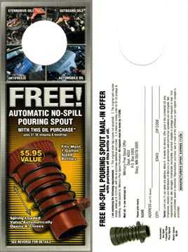 Mass retail and automotive chains with case pack sales could offer an Oil Buddy spout in the case in addition to a mail-in coupon. Again, the objective is to win over your competitor's customers and build consumer loyalty to your brand. |